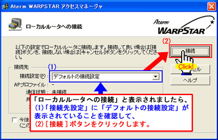 ローカルルータモードで設定している場合は「デフォルトの接続」と表示されます