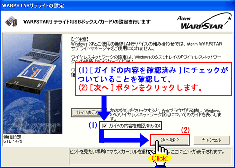 「WARPSTARサテライト(USBボックス/カード)の設定を行います」と表示されましたら、画面内の【ご注意】をご確認の上、この画面を開いたまま次の8項の手順にお進みください。 |