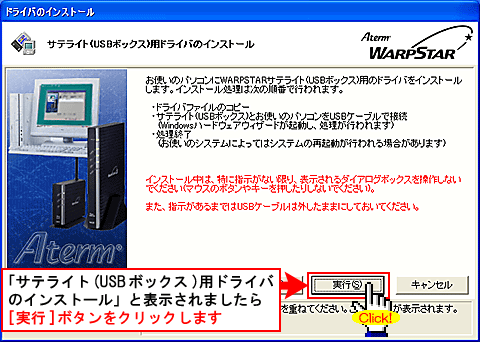 「WARPSTARサテライト(USBボックス/カード)の設定を行います」と表示されましたら、画面内の【ご注意】をご確認の上、この画面を開いたまま次の8項の手順にお進みください。 |