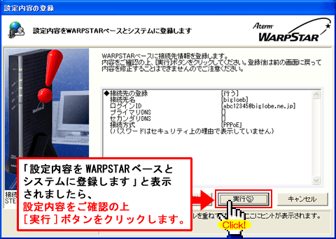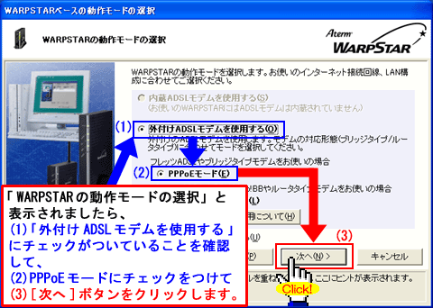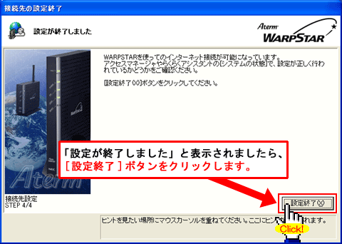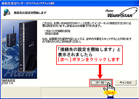Windows(R) XP Service Pack 2(SP2)をご利用の場合、Step1に「 」マークが表示され、以降の手順が行えないことがあります。このような場合は、クイック設定Webで以降の設定を行ってください。>こちらへ |