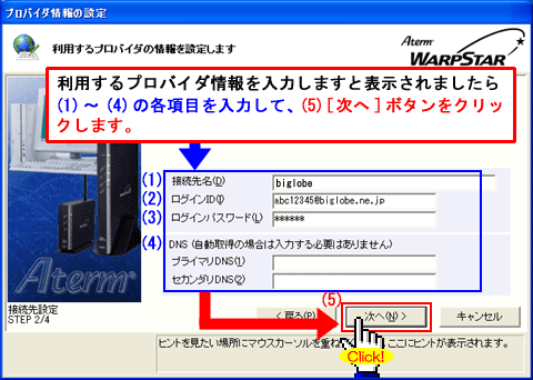(4)DNS(プライマリDNS、セカンダリDNS)はプロバイダから指定がある場合のみ入力 (指定のない場合は必要ありません)