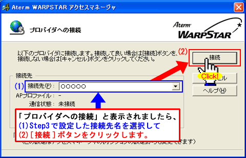 上図での、「○○○○○接続」にはStep2で作成した接続先名が入ります。