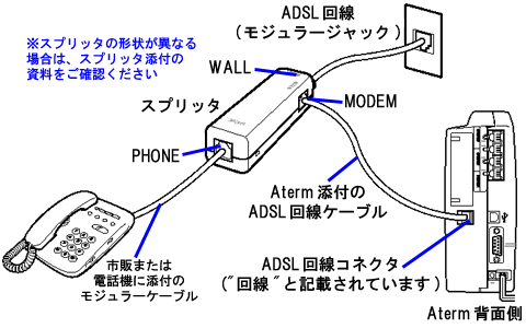 【参考1】WB65DSLの内蔵ADSLモデムを利用する場合の基本的な配線図