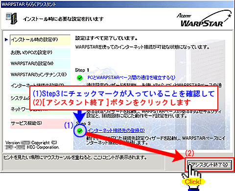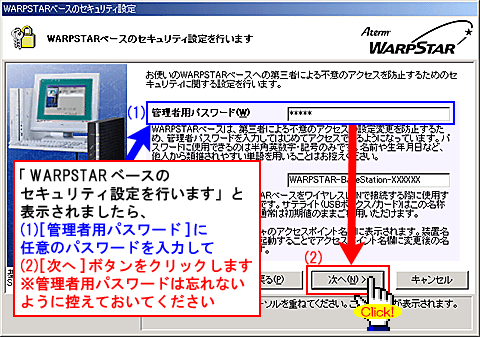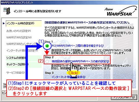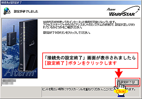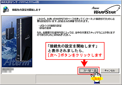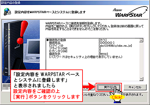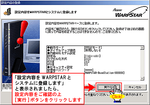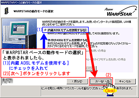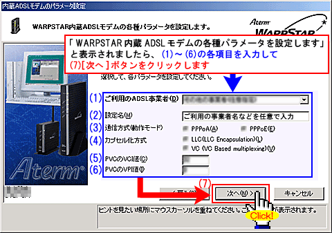 [WARPSTAR内蔵ADSLモデムの各種パラメータを設定します]と表示されましたら、