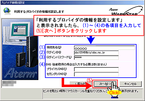 (4)DNS(プライマリDNS、セカンダリDNS)はプロバイダから指定がある場合のみ入力 (指定のない場合は必要ありません)