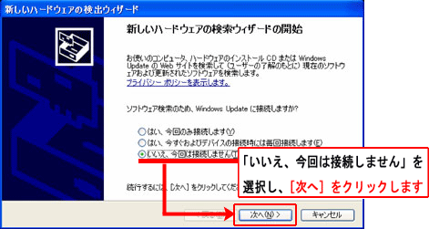 Windows(R) XP service pack 2(SP2)をインストールしたパソコンで、WL11C/WL11CAドライバを組み込もうとすると以下のような画面が表示される場合があります。その場合は、[いいえ、今回は接続しません]にチェックを入れてから、[次へ]をクリックします。