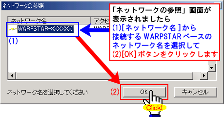 | 工場出荷時のネットワーク名は、[WARPSTAR-XXXXXX](XXXXXXはWB65DSLの側面に記載されている10BASE-T(MACアドレス)の下6桁です)。 |