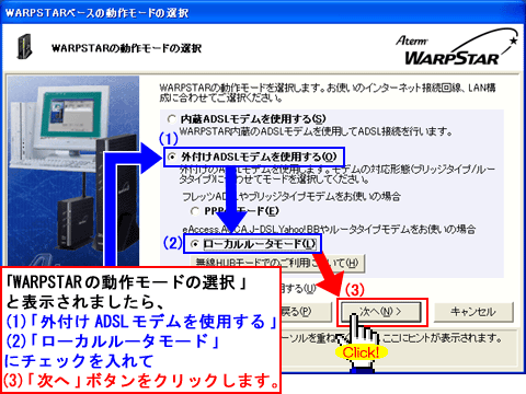 Windows(R) XP Service Pack 2(SP2)をご利用の場合、Step1に「」マークが表示され、以降の手順が行えないことがあります。このような場合は、クイック設定Webで以降の設定を行ってください。>こちらへ