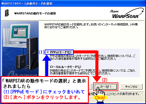 Windows(R) XP Service Pack 2(SP2)をご利用の場合、Step1に「」マークが表示され、以降の手順が行えないことがあります。このような場合は、クイック設定Webで以降の設定を行ってください。>こちらへ
