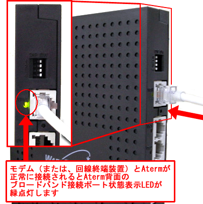 モデム(または、回線終端装置)とAtermが正常に接続されるとAterm背面のブロードバンド接続ポート状態表示LEDが緑点灯します。