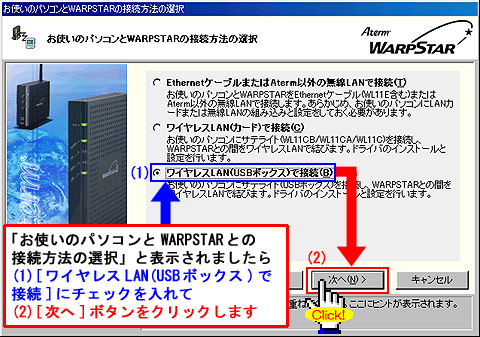 ・らくらくウィザード Ver1.00、ファームウェア Ver7.42のWB7000Hを利用。