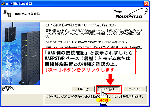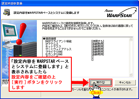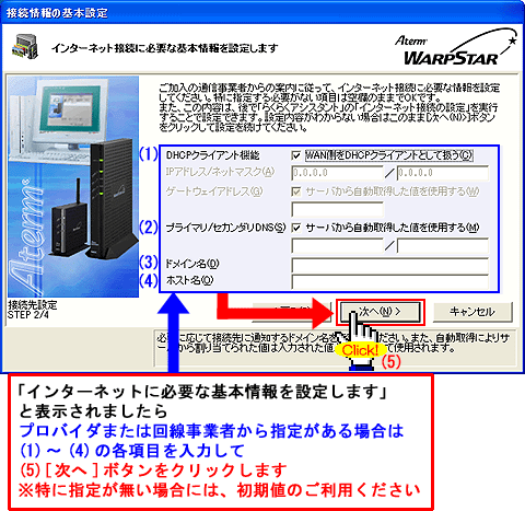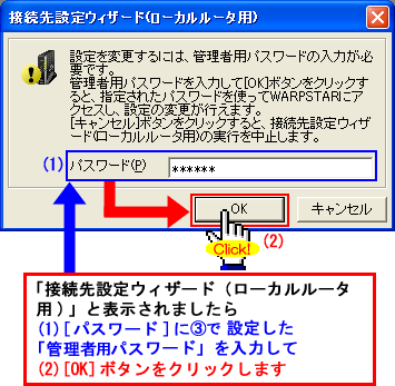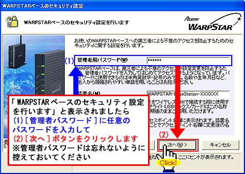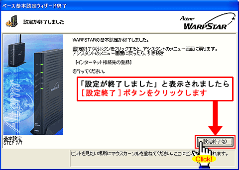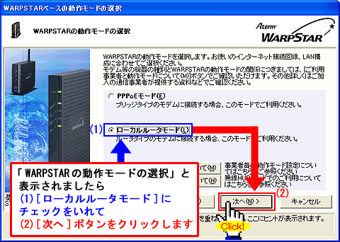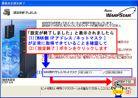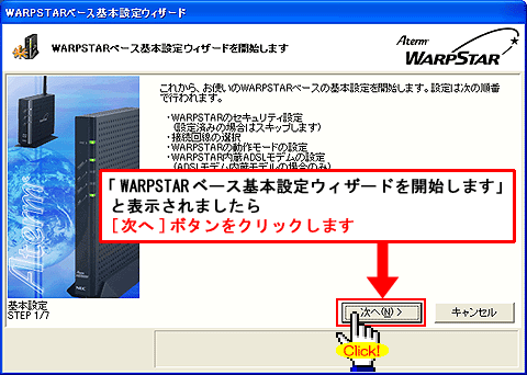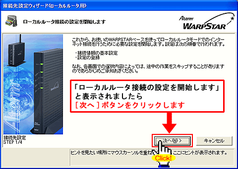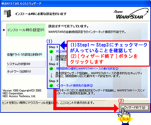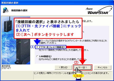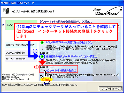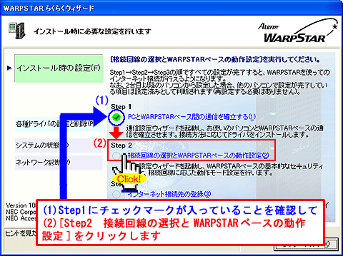 Windows(R) XP Service Pack 2(SP2)をご利用の場合、Step1に「 」マークが表示され、以降の手順が行えないことがあります。このような場合は、クイック設定Webで以降の設定を行ってください。>こちらへ |