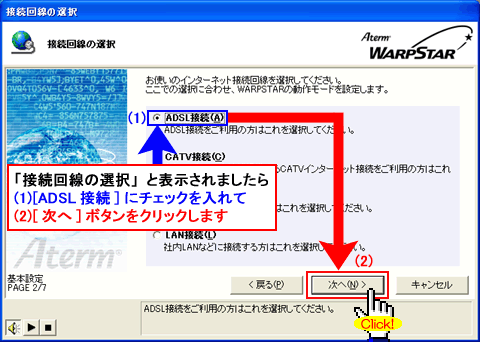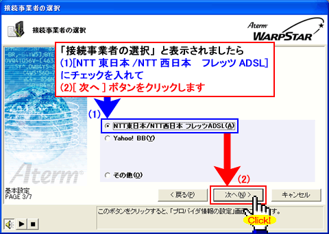 Windows(R) XP Service Pack 2(SP2)をご利用の場合、Step2に「 」マークが表示され、以降の手順が行えないことがあります。このような場合は、クイック設定Webで以降の設定を行ってください。>こちらへ |