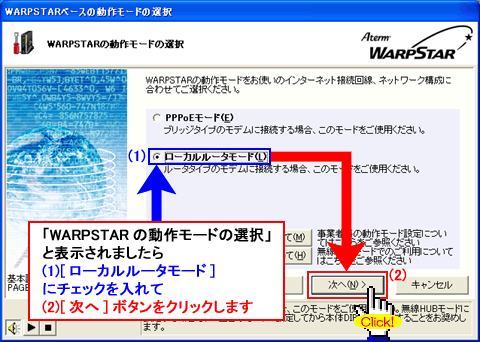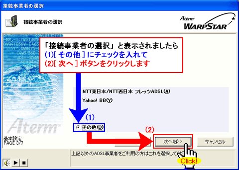 Windows(R) XP Service Pack 2(SP2)をご利用の場合、Step2に「 」マークが表示され、以降の手順が行えないことがあります。このような場合は、クイック設定Webで以降の設定を行ってください。>こちらへ |