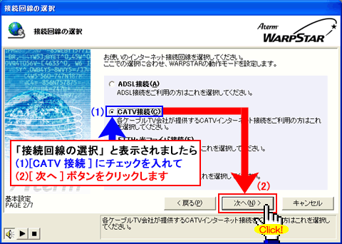 Windows(R) XP Service Pack 2(SP2)をご利用の場合、Step2に「 」マークが表示され、以降の手順が行えないことがあります。このような場合は、クイック設定Webで以降の設定を行ってください。>こちらへ |