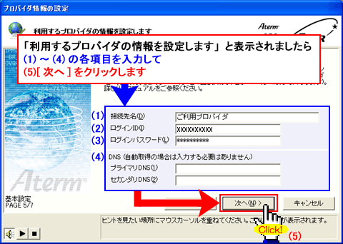 (4)DNS(プライマリDNS、セカンダリDNS)はプロバイダから指定がある場合のみ入力 (指定のない場合は必要ありません)