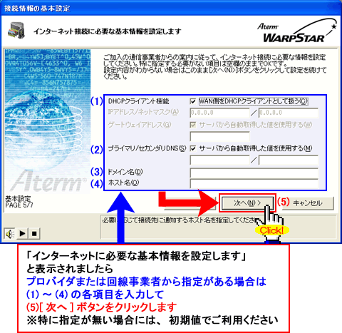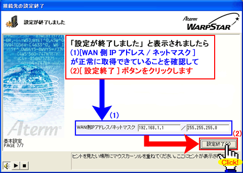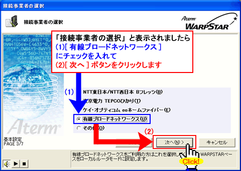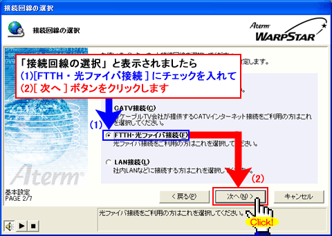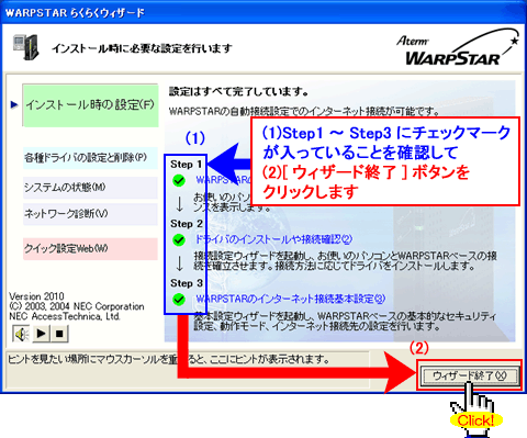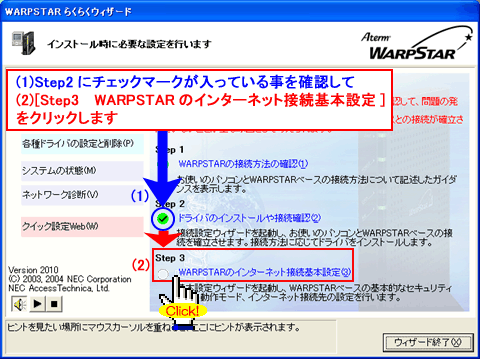 Windows(R) XP Service Pack 2(SP2)をご利用の場合、Step2に「 」マークが表示され、以降の手順が行えないことがあります。このような場合は、クイック設定Webで以降の設定を行ってください。>こちらへ |