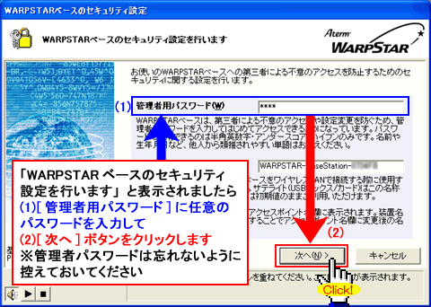 既に一度セキュリティ設定を行っている場合は「セキュリティ設定はすでに実行済みです」と表示されます。そのまま[次へ]ボタンをクリックして次の手順に進んでください。 |