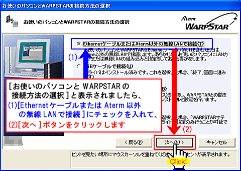 あらかじめパソコンとAtermをEthernetケーブルで接続しておいてください。