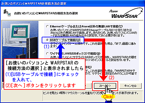 ・画面上で指示があるまで、パソコンとAtermをUSBケーブルで接続しないでください。