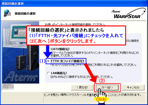 Windows(R) XP Service Pack 2(SP2)をご利用の場合、Step1に「 」マークが表示され、以降の手順が行えないことがあります。このような場合は、クイック設定Webで以降の設定を行ってください。>こちらへ |