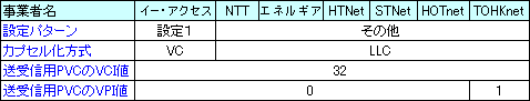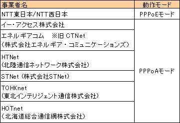 主な事業者の「動作モード」は以下の通りです。わからない場合は、ご契約のプロバイダにご確認ください。