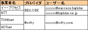 主な事業者の設定内容は、以下の通りです。わからない場合は、ご契約のプロバイダにご確認ください。