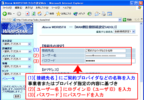 主な「ユーザー名」の入力形式は以下の通りです。ユーザー名、パスワードはプロバイダによって異なります。わからない場合は、ご契約のプロバイダにご確認ください。