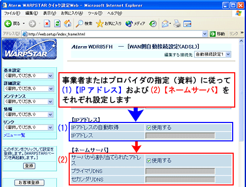 [サーバから割り当てられたアドレス]=「使用する」にチェック |