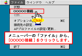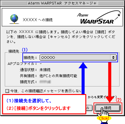 上図の、「○○○○○接続」には「PPPoE接続」または「PPPoA接続」と表示されます。 |