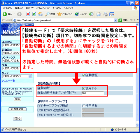 要求時接続・・・WAN側にインターネットアクセスしたときに、インターネット接続を開始します。