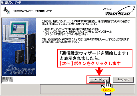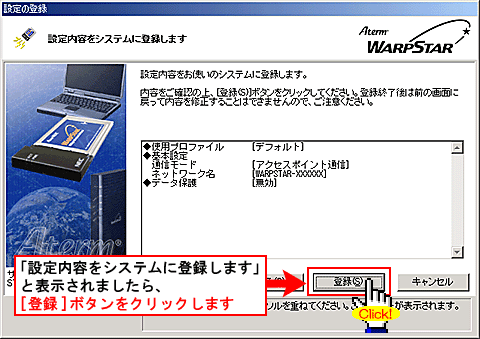 | 工場出荷時のネットワーク名は、[WARPSTAR-XXXXXX](XXXXXXはWDR85FHの側面に記載されている10BASE-T(MACアドレス)の下6桁です)。 |
