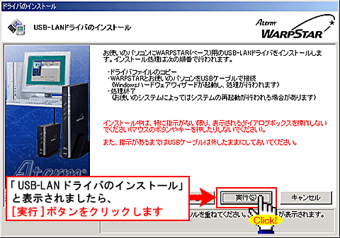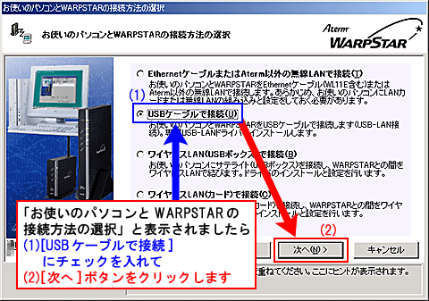 画面上で指示があるまで、パソコンとAtermをUSBケーブルで接続しないでください。