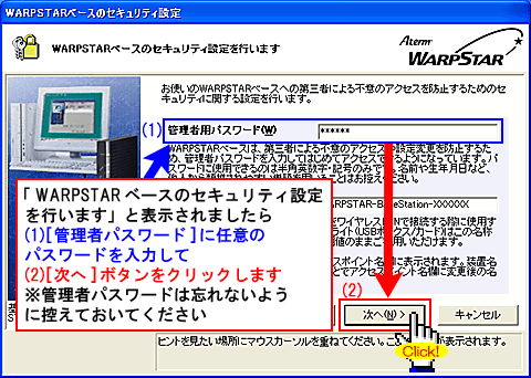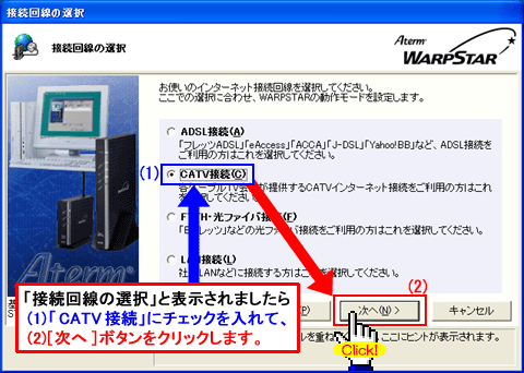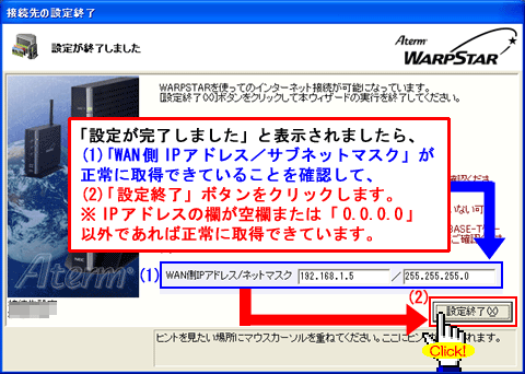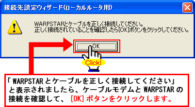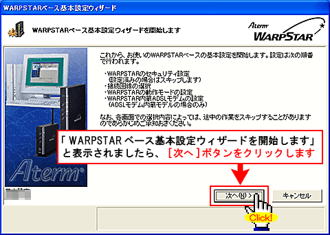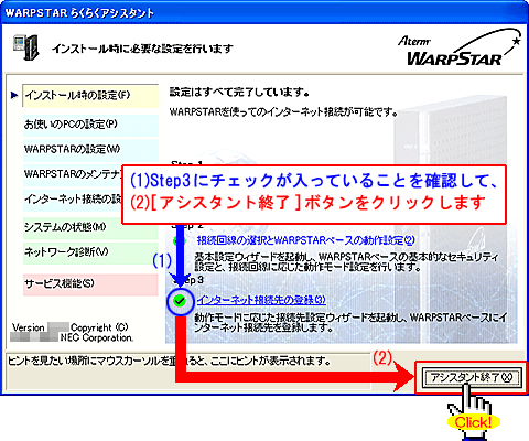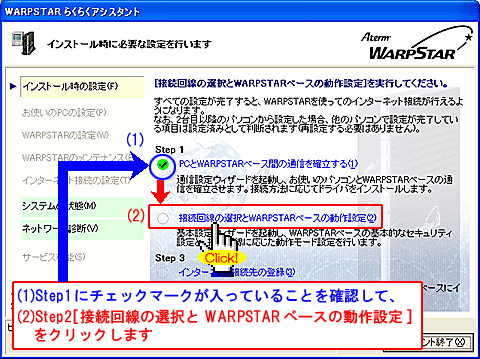 Windows(R) XP Service Pack 2(SP2)をご利用の場合、Step1に「」マークが表示され、以降の手順が行えないことがあります。このような場合は、クイック設定Webで以降の設定を行ってください。>こちらへ