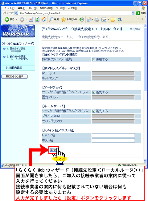 画面に「WAN側ネットワークアドレスとLAN側ネットワークアドレスの競合を検出しました。・・・」と表示された場合は、LAN側のIPアドレスの設定を行い、[設定]ボタンをクリックします。
