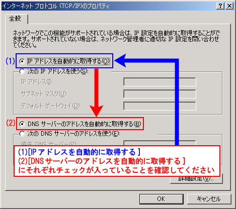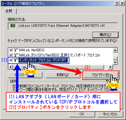 インターネットプロトコル(TCP/IP)が入っていない場合には、パソコンの説明書等をご参照の上、インストールしてください。