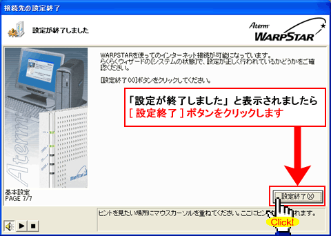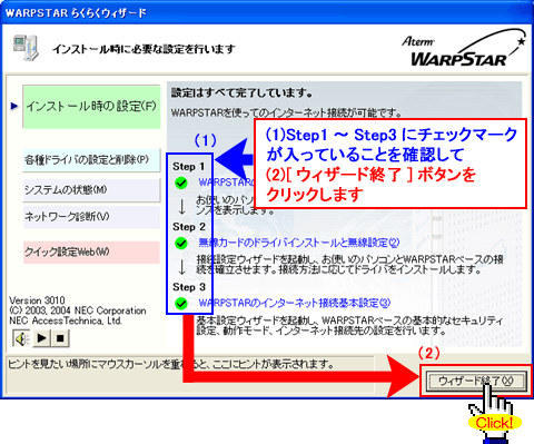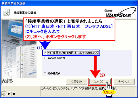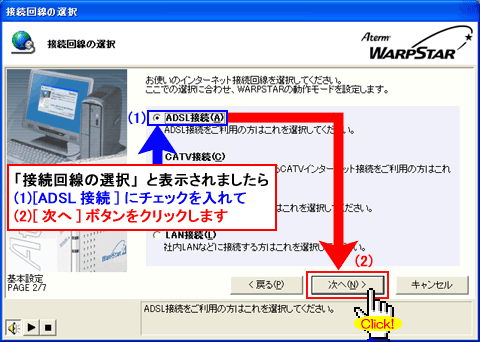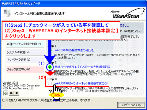Windows(R) XP Service Pack 2(SP2)をご利用の場合、Step2に「 」マークが表示され、以降の手順が行えないことがあります。このような場合は、クイック設定Webで以降の設定を行ってください。>こちらへ |