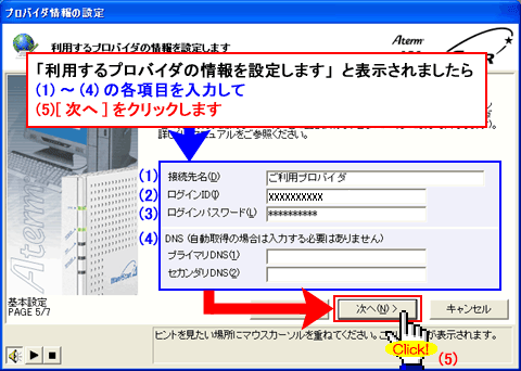 (4)DNS(プライマリDNS、セカンダリDNS)はプロバイダから指定がある場合のみ入力 (指定のない場合は必要ありません)
