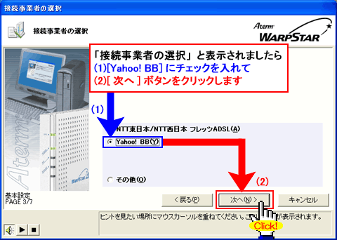 Windows(R) XP Service Pack 2(SP2)をご利用の場合、Step2に「 」マークが表示され、以降の手順が行えないことがあります。このような場合は、クイック設定Webで以降の設定を行ってください。>こちらへ |