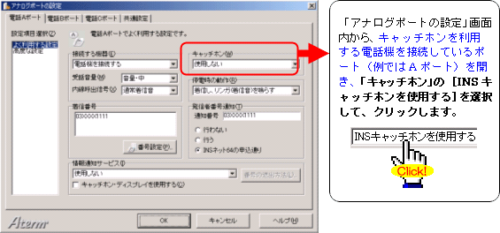 注:FAXやモデムを接続したポートには、キャッチホンを設定しないでください。通信中に割込音が入ると、通信エラーとなります。