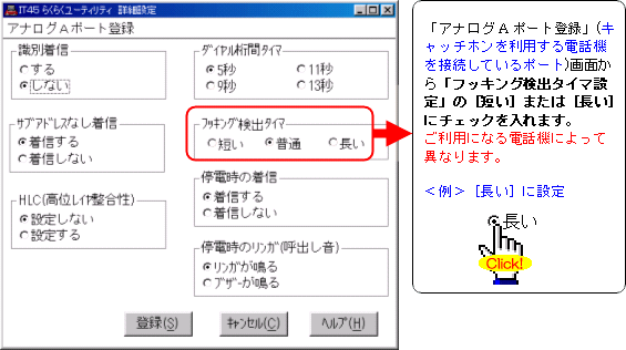 フッキングがうまく働かないとき(キャッチホンの切り替えができないときなど)は、以下の手順でフッキング検出タイマを調整してください。