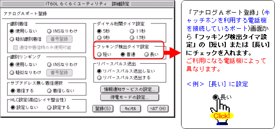 フッキングがうまく働かないとき(キャッチホンの切り替えができないときなど)は、以下の手順でフッキング検出タイマを調整してください。
