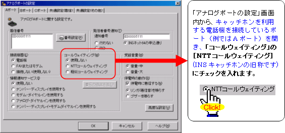 注:FAXやモデムを接続したポートには、キャッチホンを設定しないでください。通信中に割込音が入ると、通信エラーとなります。