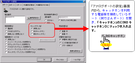 注:FAXやモデムを接続したポートには、キャッチホンを設定しないでください。通信中に割込音が入ると、通信エラーとなります。