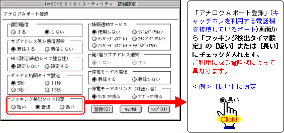フッキングがうまく働かないとき(キャッチホンの切り替えができないときなど)は、以下の手順でフッキング検出タイマを調整してください。