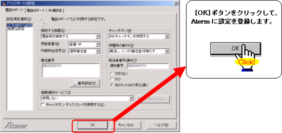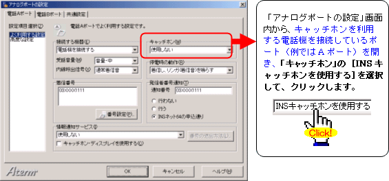 注:FAXやモデムを接続したポートには、キャッチホンを設定しないでください。通信中に割込音が入ると、通信エラーとなります。