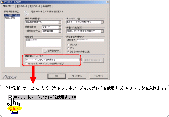 注:FAXやモデムを接続したポートには、キャッチホンを設定しないでください。通信中に割込音が入ると、通信エラーとなります。
