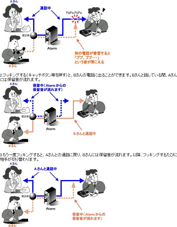 通話中に別の電話がかかってきた際に「キャッチ」ボタン(名称はご利用の電話機によって異なります)を押して、切り替えます。