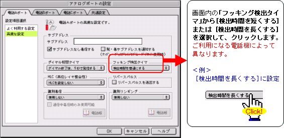 フッキングがうまく働かないとき(キャッチホンの切り替えができないときなど)は、以下の手順でフッキング検出タイマを調整してください。