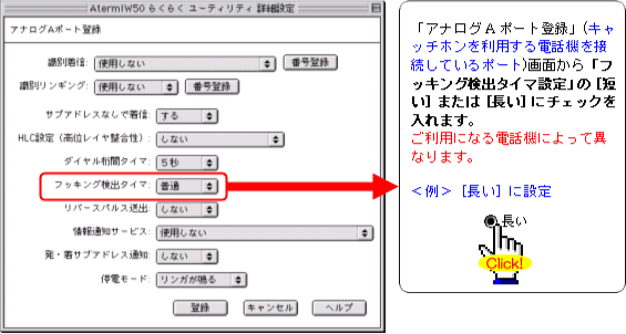 フッキングがうまく働かないとき(キャッチホンの切り替えができないときなど)は、以下の手順でフッキング検出タイマを調整してください。